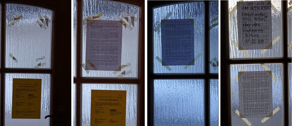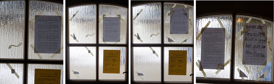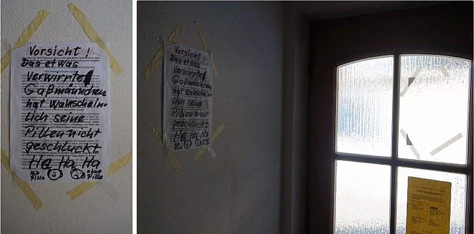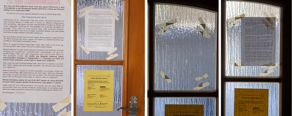 Er riß sofort dieses Schreiben an Alle Hausbewohner ab. Daraus ergaben sich dann diese ganzen folgenden Fotos. Von der Hausverwaltung wurde ich dann aufgefordert mein Schreiben abzunehmen, weil ich nicht das Recht dazu habe. Das Ehrhardt mich dabei wieder Beleidigt hatte, war nicht so wichtig.